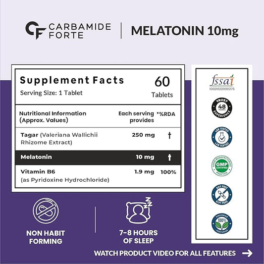 Carbamide Forte Melatonin 10 mg Sleeping Pills with Tagar 250 mg | Sleep Supplement for Men & Women | Melatonin Tablet for Restful Deep Sleeps - 60 Veg Tablets.