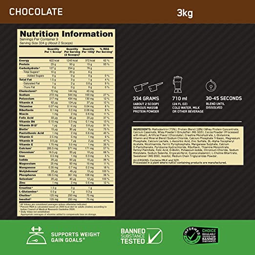OPTIMUM NUTRITION (ON) Serious Mass Gainer powder (Veg) - 3 kg (Chocolate)