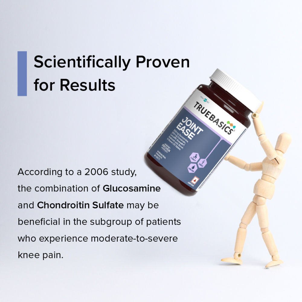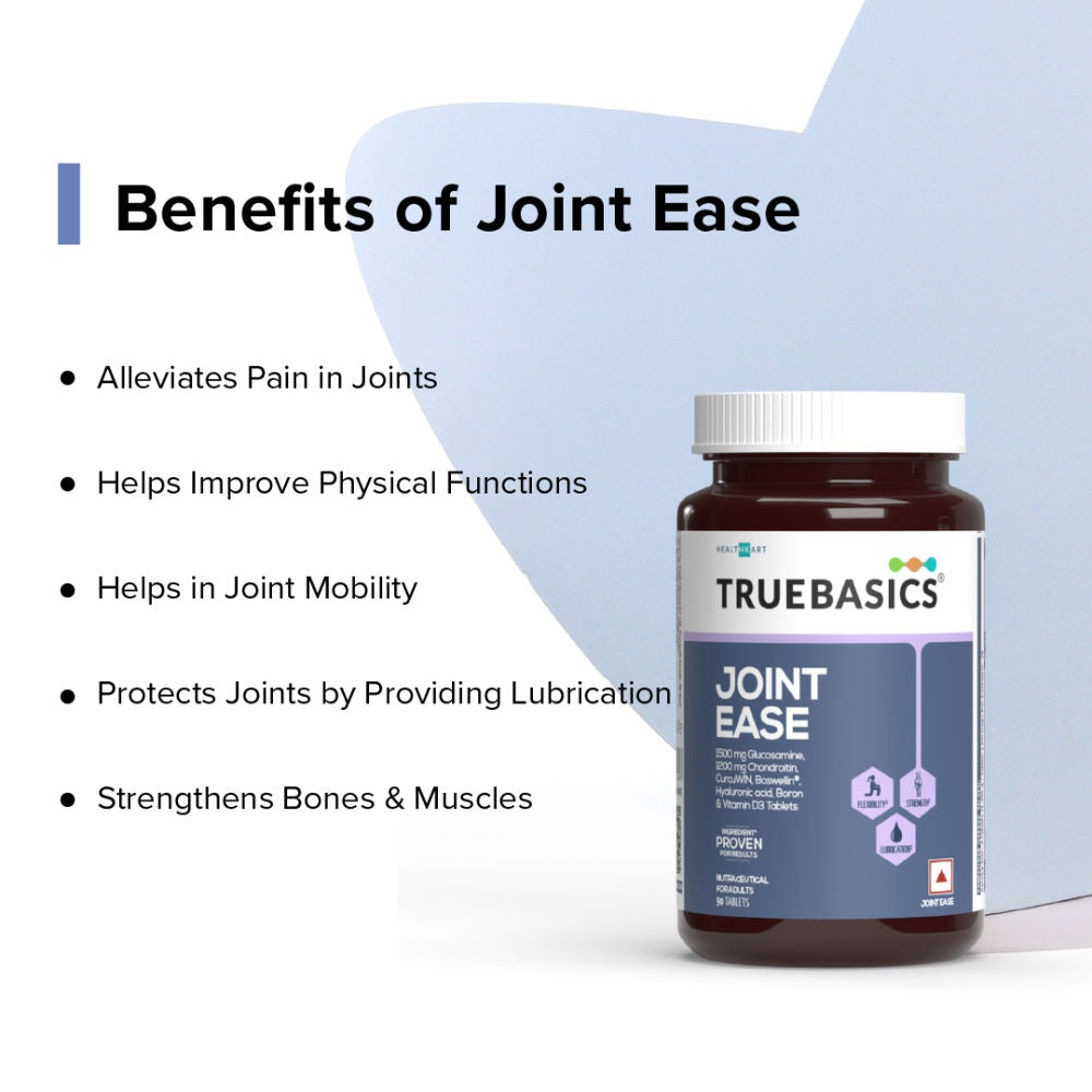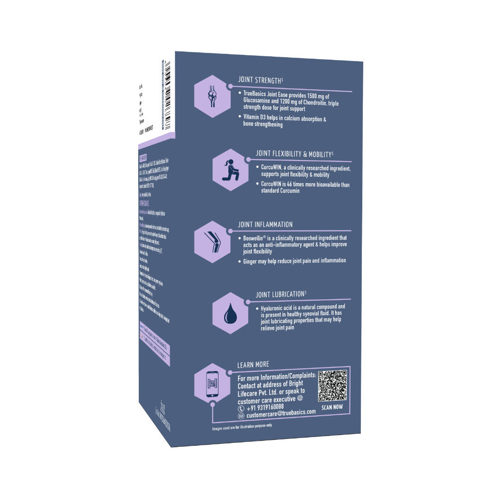 A joint is the connection between bones in the body which link the skeletal system into a functional whole. Joints are constructed to allow different degrees and types of movement. In a joint, bones do not directly contact each other. They are cushioned by cartilages, synovial membranes and a lubricating fluid (synovial fluid). Age, body weight, vigorous exercise & sports may affect bone & joint health. Joints become stiffer and less flexible as the amount of lubricating fluid inside the joints decrease and the cartilages become thinner. Ligaments also tend to shorten and lose some flexibility, making joints feel stiff. TrueBasics Joint Ease is a triple strength comprehensive nutrition formula with key ingredients including Glucosamine, Chondroitin, Hyaluronic acid, Vitamin D3, CurcuWIN, Boswellin & Boron for joint flexibility, mobility & strength.